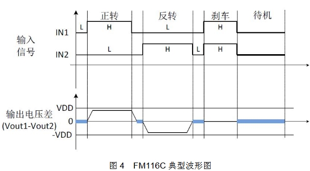 電路采用 H 橋結(jié)構(gòu), 內(nèi)置功率 MOSFET 開關(guān),可實(shí)現(xiàn)對(duì)負(fù)載直流電機(jī)正轉(zhuǎn)、反轉(zhuǎn)、剎車以及待機(jī)四個(gè)功能的控制,剎車功能能使負(fù)載電機(jī)快速停止轉(zhuǎn)動(dòng),待機(jī)功能使電路靜態(tài)功耗極低( 小于 1uA)。