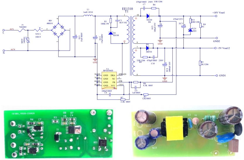 BPA8506D參考設計的電路圖和實物圖展示了其簡潔而高效的布局。通過合理選擇元件和優(yōu)化電路結構,該設計實現(xiàn)了高性能與高可靠性的平衡。例如,采用EE1310磁芯的變壓器,其初級繞組感量為950uH±7%,漏感量小于30uH,確保了高效的能量傳輸和穩(wěn)定的輸出電壓。此外,電路中還配備了多種保護機制,如短路保護、過流保護等,進一步提升了系統(tǒng)的安全性。