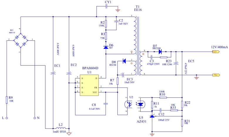 BPA8604D的電路設(shè)計簡潔而高效,充分體現(xiàn)了其高度集成化的特點(diǎn)。從電路圖中可以看出,整個電源電路主要由輸入濾波、整流橋、變壓器、反饋電路和輸出濾波等部分組成。輸入濾波部分采用了電解電容和貼片電容的組合,能夠有效濾除輸入電壓中的高頻噪聲,為后續(xù)電路提供穩(wěn)定的輸入電壓。
