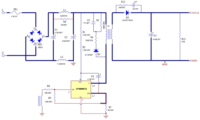 該電源適配器的電路設(shè)計遵循典型的開關(guān)電源架構(gòu),通過 LP3669CS 芯片實現(xiàn)精準的電壓與電流控制,搭配 SS210 二極管完成高效的整流任務(wù)。輸入端接入 90-265VAC 的寬電壓范圍交流電,經(jīng)由整流橋轉(zhuǎn)換為脈動直流電,隨后進入由 LP3669CS 控制的開關(guān)變換環(huán)節(jié)。