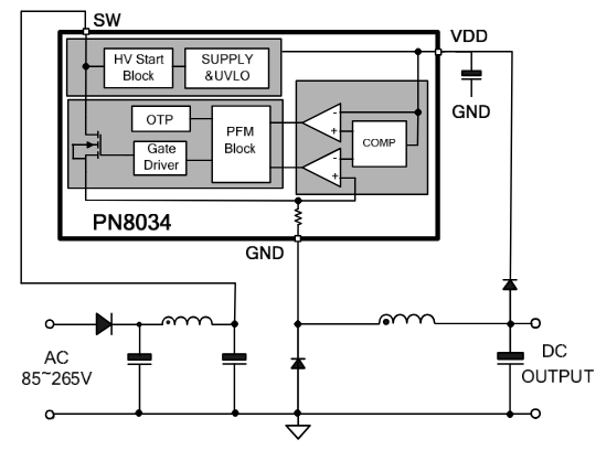 PN8034內(nèi)置高壓啟動(dòng)模塊,能夠?qū)崿F(xiàn)系統(tǒng)快速啟動(dòng)和超低待機(jī)功耗,待機(jī)功耗低于100mW。