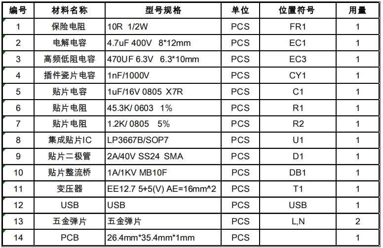物料清單是實現(xiàn)電路設(shè)計的基礎(chǔ),它詳細(xì)列出了電路中所使用的各種元件及其規(guī)格型號。在 LP3667B 5V1A 充電器的 BOM 表中,涵蓋了保險電阻、電解電容、高頻低阻電容、瓷片電容、貼片電阻、集成貼片 IC、貼片二極管、貼片整流橋、變壓器、USB 接口、五金彈片以及 PCB 等多種元件。例如,保險電阻采用 10R 1/2W 的規(guī)格,用于電路的過流保護;電解電容選用 4.7uF 400V 的型號,用于輸入濾波;高頻低阻電容則采用 470uF 6.3V 的規(guī)格,用于輸出濾波,以降低輸出紋波。這些元件的合理選型和搭配,共同構(gòu)成了一個高效、穩(wěn)定的充電器電路。