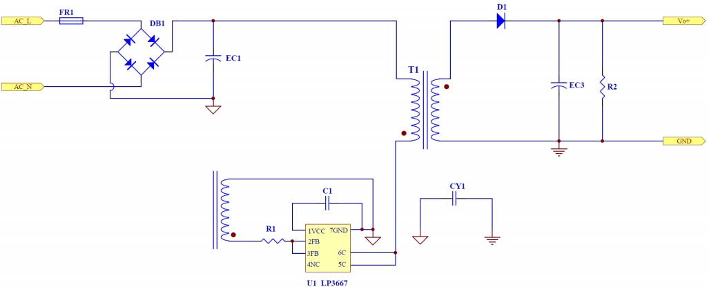充電器的電路設(shè)計是其核心部分,其電路圖展示了各個元件的連接關(guān)系和功能。從電路圖中可以看出,該設(shè)計采用了典型的開關(guān)電源架構(gòu),主要包括輸入整流濾波電路、主控芯片 LP3667B、變壓器 T1、輸出整流濾波電路以及保護電路等關(guān)鍵部分。輸入整流濾波電路將交流輸入轉(zhuǎn)換為直流,并通過濾波電容去除高頻噪聲,為后續(xù)電路提供穩(wěn)定的直流輸入。主控芯片 LP3667B 作為整個充電器的“大腦”,負(fù)責(zé)控制開關(guān)頻率、占空比以及實現(xiàn)各種保護功能,確保充電過程的安全與高效。變壓器 T1 是實現(xiàn)電壓轉(zhuǎn)換和電氣隔離的關(guān)鍵元件,其三繞組結(jié)構(gòu)能夠有效降低電磁干擾并提高轉(zhuǎn)換效率。輸出整流濾波電路則將變壓器次級輸出的高頻脈沖轉(zhuǎn)換為穩(wěn)定的直流輸出,并通過濾波電容去除輸出紋波,保證輸出電壓的純凈度。