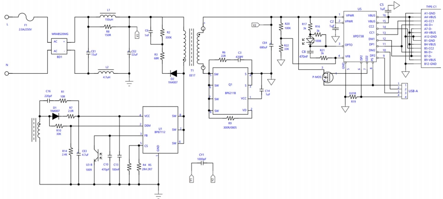 在當(dāng)今快速發(fā)展的電子設(shè)備市場中,電源適配器的性能和效率對于設(shè)備的穩(wěn)定運(yùn)行至關(guān)重要。隨著USB-C接口和USB-PD協(xié)議的廣泛應(yīng)用,市場對高性能、高效率的電源適配器的需求日益增加。本文將詳細(xì)介紹基于BP87112和BP6211B芯片的20W A+C電源適配器參考設(shè)計(jì),該設(shè)計(jì)支持12V/1.67A、9V/2.22A和5V/3A的輸出規(guī)格,旨在為用戶提供一個高效、可靠的電源解決方案。