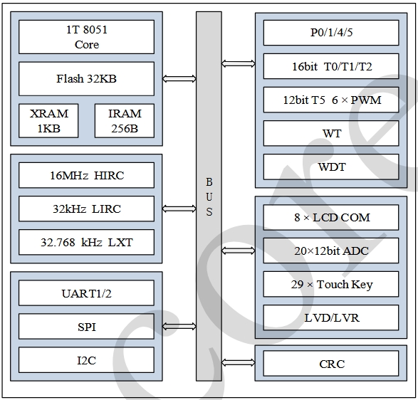 時鐘系統(tǒng):芯片內置 16MHz 的高速振蕩器(HIRC)和 32kHz 的低速振蕩器(LIRC),同時支持外部低速晶振(LXT)輸入,最高可達 32.768kHz。這些時鐘源為系統(tǒng)提供了靈活的時鐘選擇,以適應不同的工作模式和功耗要求。