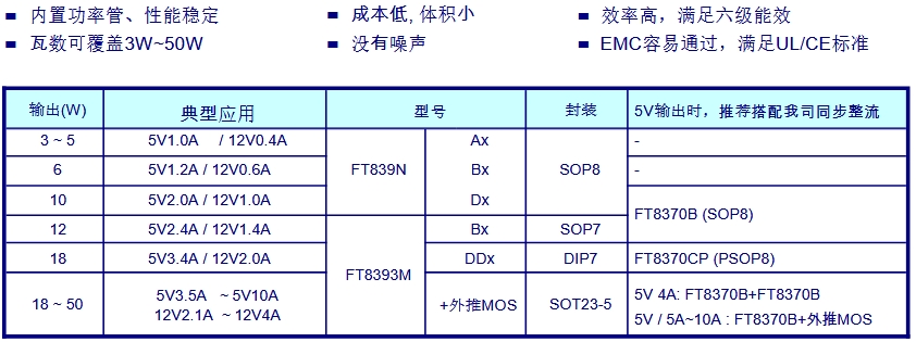 FT839xx/FT8393xx系列芯片是專為滿足DoE(美國能源部)和CoC(歐洲協(xié)調(diào)委員會)六級能效標準而設計的AC-DC恒壓恒流芯片。該系列芯片內(nèi)置功率管,具備性能穩(wěn)定、成本低、體積小、效率高等特點,能夠覆蓋3W~50W的瓦數(shù)范圍,廣泛適用于各種電子設備的充電器和適配器設計。