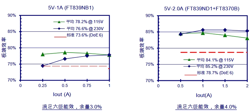 FT839xx/FT8393xx系列芯片在設計上充分考慮了能效優(yōu)化,能夠輕松滿足DoE和CoC六級能效標準。以FT839NB1為例,在115V和230V輸入電壓下,其平均效率分別達到了78.2%和76.6%,遠高于標準要求的73.6%,且余量達到了3.0%。這意味著在實際使用中,該芯片不僅能夠高效地將電能轉(zhuǎn)換為設備所需的能量,還能在不同負載條件下保持穩(wěn)定的能效表現(xiàn)。