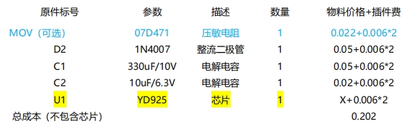 從 BOM 方案及成本來看,YD925 方案的物料種類大幅減少,且大多為貼片元件,尺寸小,可實現(xiàn)全貼片加工,極大地降低了生產(chǎn)成本和體積。以一個典型的 5V 輸出供電方案為例,YD925 的外圍電路簡潔明了,主要包括壓敏電阻(可選)、整流二極管、電解電容等常見元件,總成本(不包含芯片)僅為 0.202 元,相比傳統(tǒng)阻容降壓方案的 0.479+0.4 元,成本優(yōu)勢不言而喻。