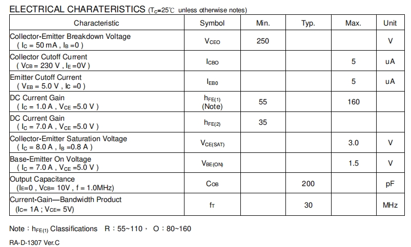 集電極 - 發(fā)射極飽和電壓(VCE(SAT)):在集電極電流為8.0A,基極電流為0.8A時(shí),VCE(SAT)的最大值為3.0V。較低的飽和電壓意味著在晶體管導(dǎo)通時(shí),能量損耗較小,從而提高了功率放大器的效率。