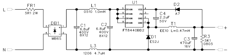 該電路原理圖中,F(xiàn)T8440BD2作為核心芯片,通過合理的元件布局和連接,實現(xiàn)了高精度恒壓輸出。電路中包括了輸入整流橋、濾波電容、高壓啟動電阻、反饋網(wǎng)絡(luò)、續(xù)流二極管、電感等關(guān)鍵元件,這些元件協(xié)同工作,確保電源的穩(wěn)定運行。