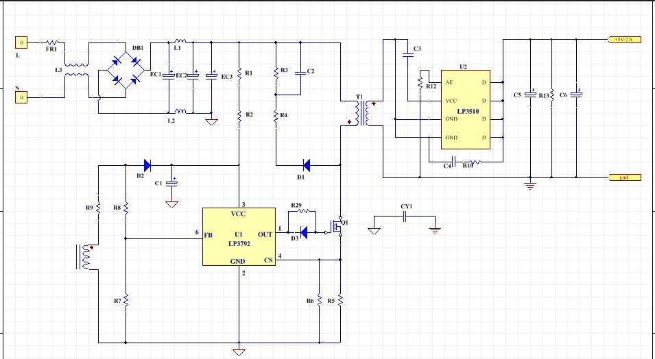 LP3792通過采樣輔助繞組平臺電壓,分壓后與內(nèi)部基準(zhǔn)比較形成閉環(huán)后,來恒定輸出電壓Vo。