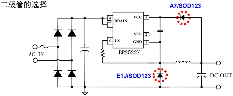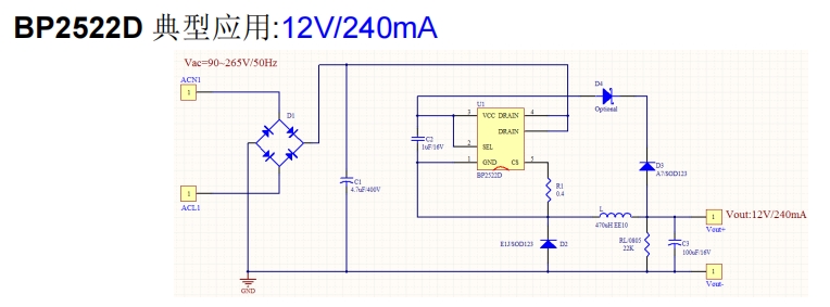 以BP2522D為例,持續(xù)輸出240mA,脈沖350mA,電感量為470uH,電感電流紋波為57mA。最大峰值電流為579mA,BP2522D內部MOS管限制最大電流為750mA,留有一定余量,可取Rcs=0.3ohm。