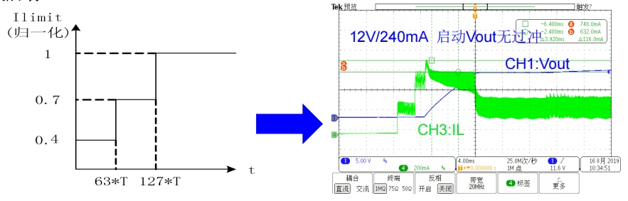 BP2522D具備軟啟動功能,通過分段增加峰值電流來減小開關應力,避免輸出電壓過沖現象。軟啟動分為三個階段:第一階段Ipk1=0.4Ilimit,第二階段Ipk2=0.7Ilimit,第三階段Ipk3等于設置的Ilimit。在重載下啟動時,系統(tǒng)會觸發(fā)降頻模式,工作頻率降為滿載的1/4。