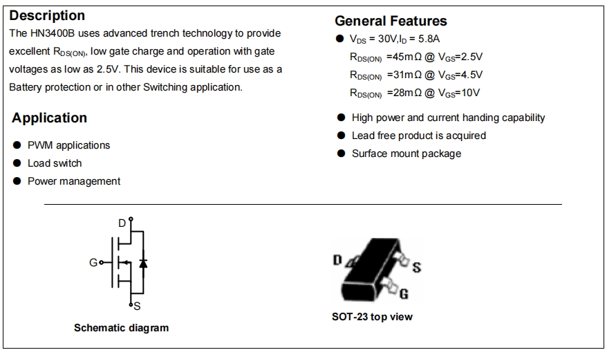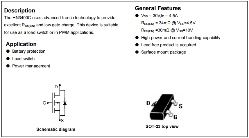 HN3400C:小電流、高速度、低電荷,適合做高頻 PWM 或負(fù)載開關(guān),散熱更好(R<sub> 僅 73.5 °C/W)。