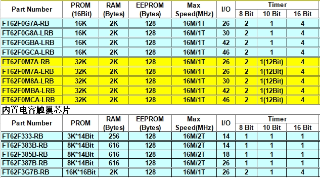 | FT61F021 | 2K Flash/128RAM/256EE | 16MHz | 10bit×3+12bit×1 | 8通道 | LED驅(qū)動(dòng)+UART |