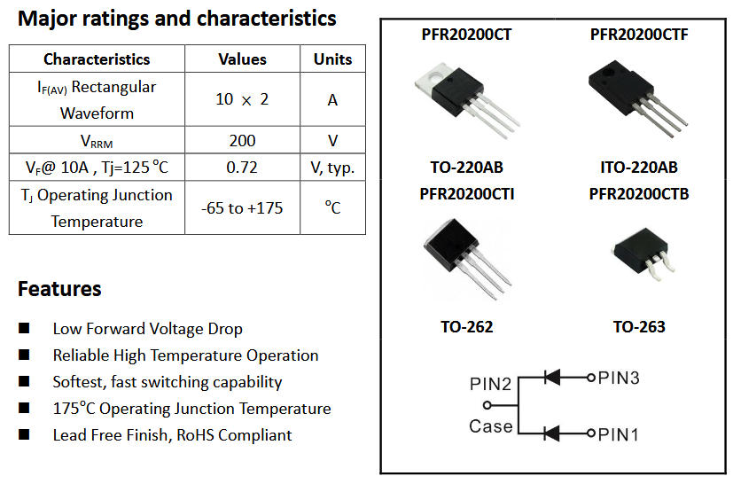在中大功率開關(guān)電源、PFC 升壓電路或逆變器次級(jí)整流中,總有一顆“黑扁”TO-220 封裝器件被工程師們反復(fù)提到——它就是 PFR20200CTF。很多人第一次聽到這個(gè)料號(hào)時(shí)都會(huì)疑惑:它到底是三極管還是 MOS?其實(shí),它是一顆把“肖特基”和“MOS 結(jié)構(gòu)”揉在一起的功率整流二極管,由 PFC Device Inc. 推出,主打 200 V/20 A、超低正向壓降(Low VF)和快恢復(fù)特性,下面帶你一次性把它摸透。