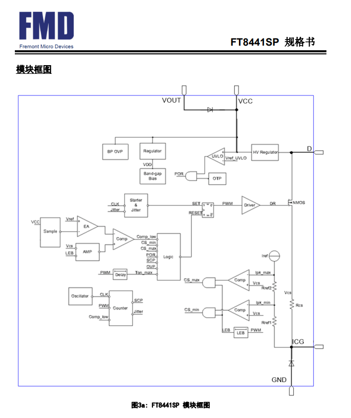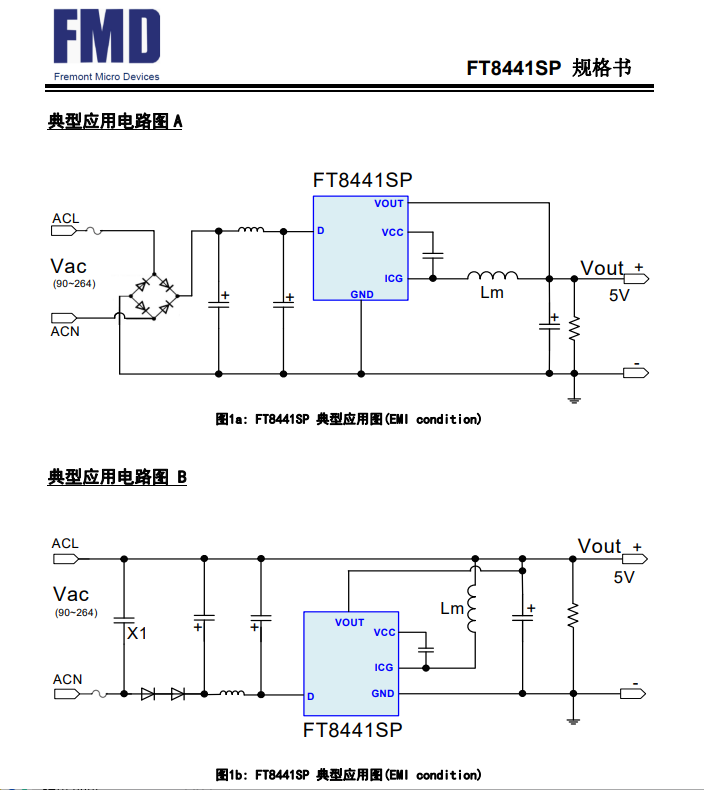 FT8441SP采用極高壓技術(shù),通過內(nèi)置高壓啟動(dòng)電路、高壓功率MOSFET開關(guān)以及電流采樣電阻,減少了外圍元器件,大大的簡化了系統(tǒng)應(yīng)用。內(nèi)置的抖頻和軟驅(qū)動(dòng)技術(shù)有效的提高了EMI性能。