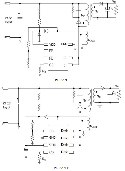 PL3367CE同時(shí)具有多種保護(hù)功能:逐周期峰值電流檢測(cè)、VDD 欠壓/過(guò)壓保護(hù)、輸出過(guò)壓保護(hù)、輸出短路保護(hù)和過(guò)溫保護(hù)等。
