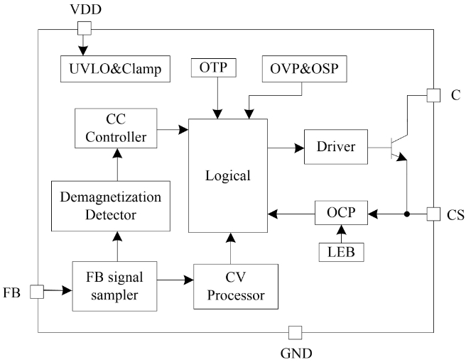 PL3367CE是一系列原邊控制,用于反激式開(kāi)關(guān)電源的恒流/恒壓調(diào)節(jié)器。其高度集成了功率開(kāi)關(guān),并通過(guò)去除光耦以及次級(jí)控制電路,在簡(jiǎn)化充電器/適配器等傳統(tǒng)的恒流/恒壓設(shè)計(jì)的同時(shí)實(shí)現(xiàn)了精確的電流和電壓調(diào)節(jié),內(nèi)部框架圖如下圖所示。