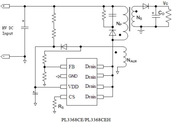 PL3368CE同時(shí)具有多種保護(hù)功能:逐周期峰值電流檢測、VDD 欠壓/過壓保護(hù)、輸出過壓保護(hù)、輸出短路保護(hù)和過溫保護(hù)等。