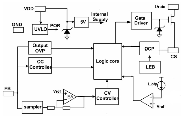 PL3326CE 是一系列高效率、高集成度、原邊調(diào)節(jié)的 PWM功率開關,其主要應用于小于 15W 的 AC/DC 反激式開關電源。PL3326CE 通過去除光耦以及次級控制電路,簡化了充電器/適配器等傳統(tǒng)的恒流/恒壓的設計,從而實現(xiàn)高精度的電壓和電流調(diào)節(jié),內(nèi)部框架圖如下所示~