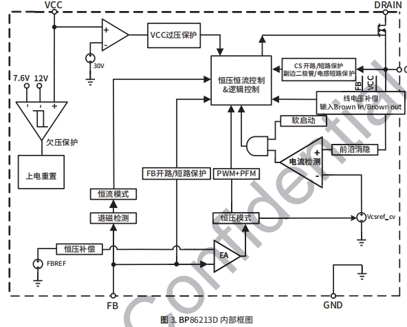 BP86213D 芯片集成650VMOSFET、高壓?jiǎn)?dòng)和供電電 保護(hù)功能 路。采用PWM/PFM多模式控制技術(shù),從輔助繞組給VCO 輸入欠壓保護(hù)(Brown-in/out) 供電,能有效降低系統(tǒng)待機(jī)功耗,提高效率和動(dòng)態(tài)性能, 并減小系統(tǒng)工作在輕載時(shí)的噪聲。
