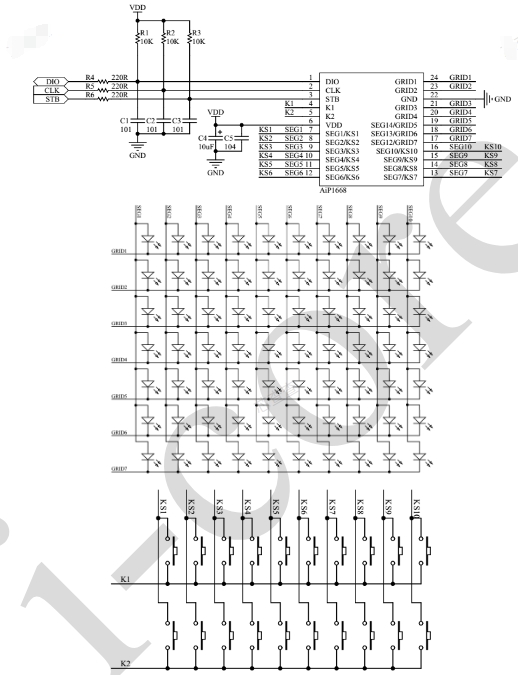 AiP1668是帶鍵盤掃描接口的LED驅(qū)動控制專用電路,內(nèi)部集成有MCU數(shù)字接口、數(shù)據(jù)鎖存器、鍵盤掃描等電路。本產(chǎn)品主要應(yīng)用于VCR、VCD、DVD及家庭影院等產(chǎn)品的顯示屏驅(qū)動。